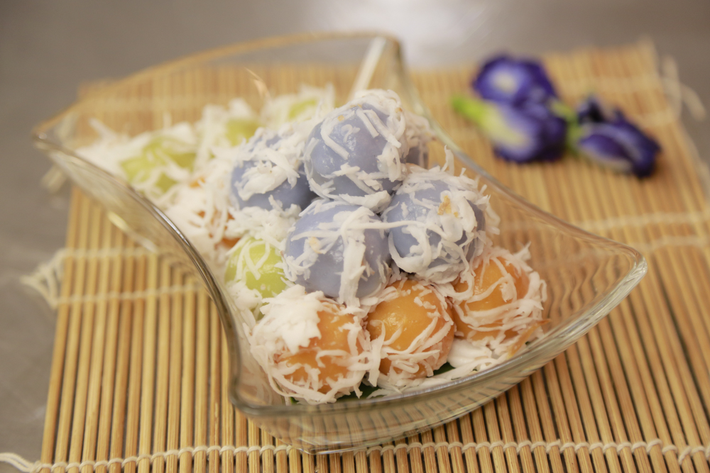 ขนมต้ม ตัวขนมทำจากแป้งข้าวเหนียวส่วนไส้ทำจากมะพร้าวกวนกับน้ำตาลเป็นไส้ ควรเลือกมะพร้าวทึนทึกจะทำให้ขนมนุ่ม ถ้าแก่ไปจะแข็ง ไม่อร่อย